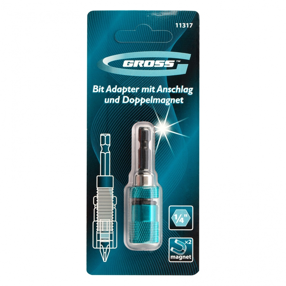 Адаптер для бит с ограничителем и двойн.магнитом 1/4" Gross