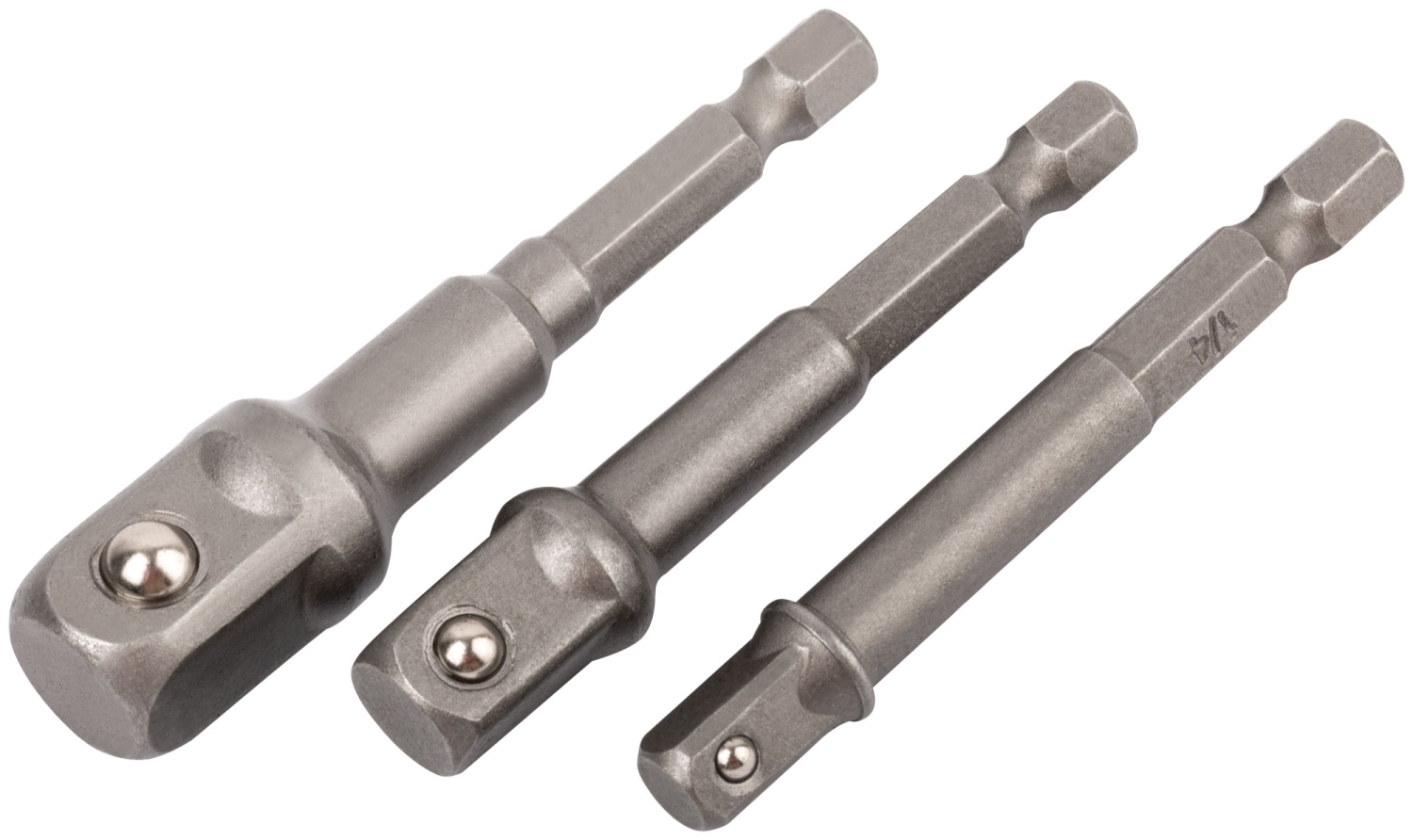 Под головки с хвостовика под биты. В наборе: 3 адаптера (1/4", 3/8", 1/2"). Материал: легированная сталь. Упаковка: блистер.