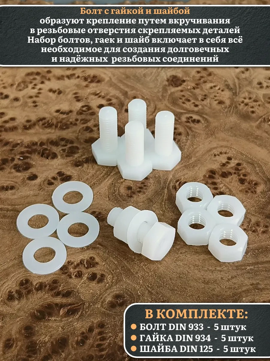 Болт полиамидный 10х20 мм DIN 933 с гайкой и шайбой, по 5 шт.