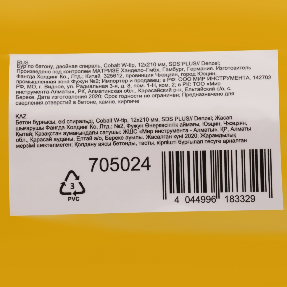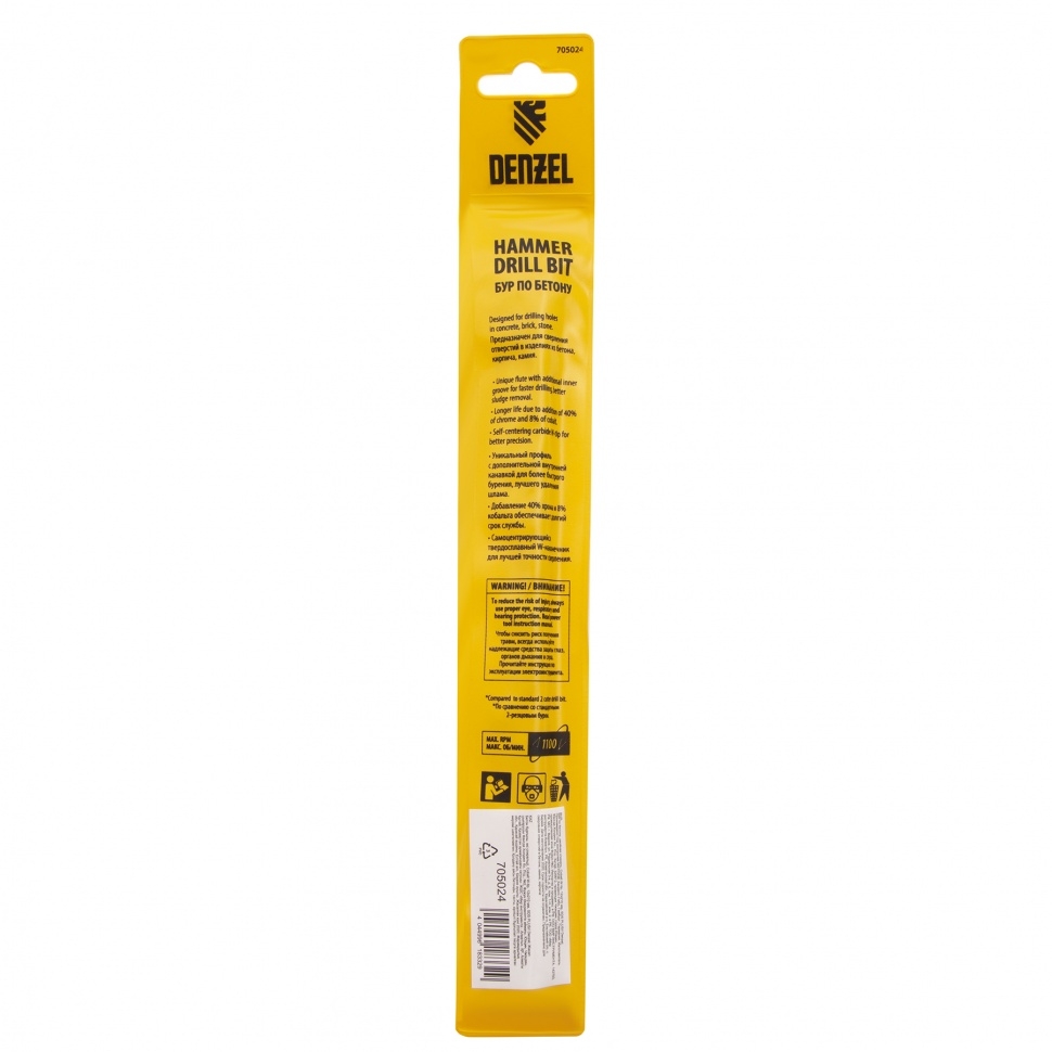 Бур по бетону Denzel арт. 705024 с хвостовиком SDS PLUS и двойной спиралью предназначен для сверления бетона, кирпича и камня. Он используется в качестве оснастки для перфораторов с патроном SDS Plus. Бур оптимален для проведения строительных, ремонтных, монтажных работ. Преимущества Продуманная конструкция — режущая твердосплавная пластина из стали ВК8 80-90 HRC с W-образной заточкой имеет высокий ресурс и способна сверлить отверстия до 30% быстрее, в том числе при работе с камнем. Прочность и износостойкость — рабочая часть из легированной стали 40Х выдерживает интенсивные и длительные ударные нагрузки, а также делает бур самым высокопроизводительным среди аналогов средней цены. Двойная спираль и канавка с дополнительным желобом — за счет более эффективного отвода шлама рабочая часть не перегревается, такая разработка позволяет продлить срок службы бура. Высокая технологичность — буры Denzel изготавливаются на производстве MAKITA, что гарантирует их качество и эффективность сверления. Бур поставляется в у