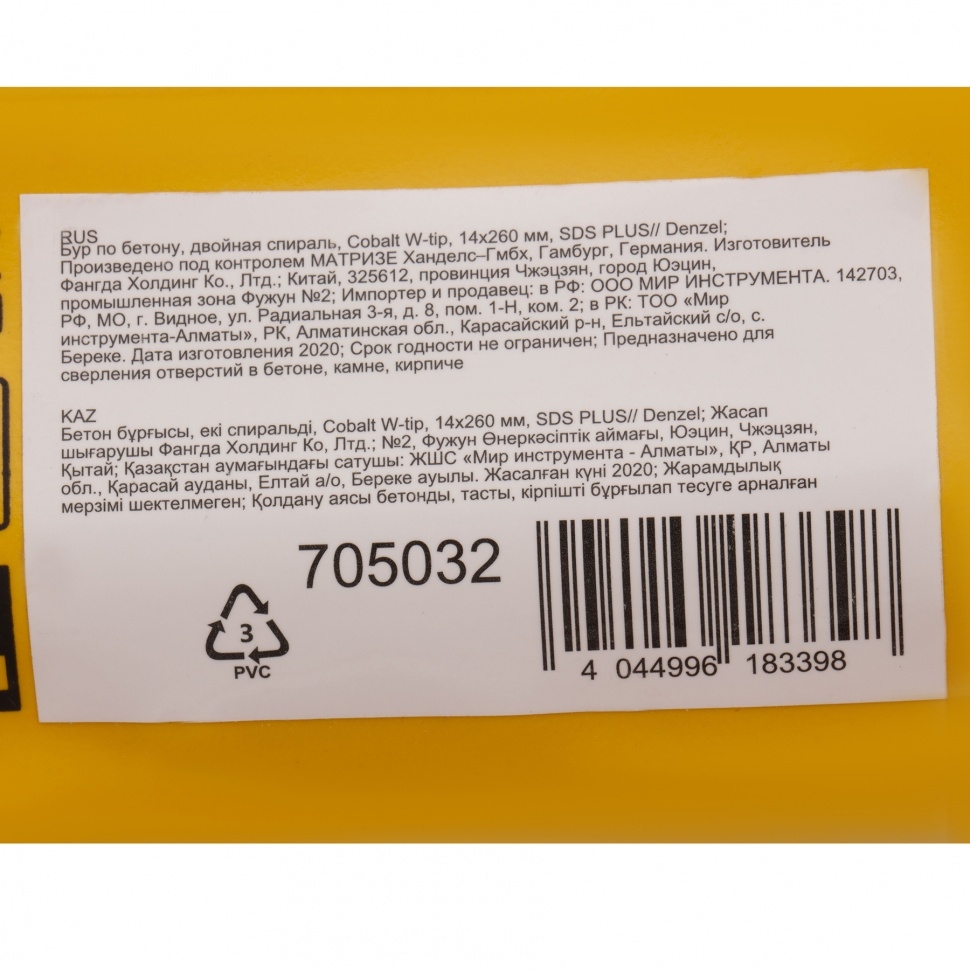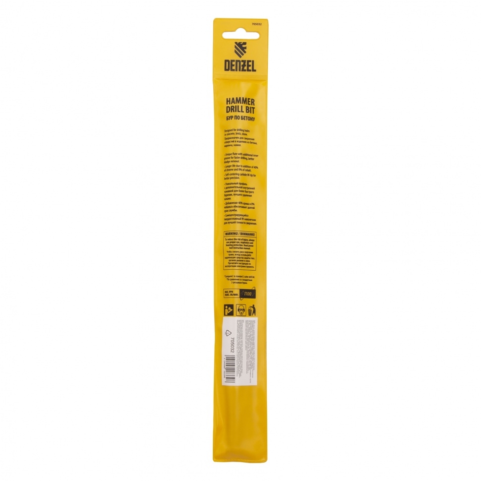 Бур по бетону Denzel арт. 705032 с хвостовиком SDS PLUS и двойной спиралью предназначен для сверления бетона, кирпича и камня. Он используется в качестве оснастки для перфораторов с патроном SDS Plus. Бур оптимален для проведения строительных, ремонтных, монтажных работ. Преимущества Продуманная конструкция — режущая твердосплавная пластина из стали ВК8 80-90 HRC с W-образной заточкой имеет высокий ресурс и способна сверлить отверстия до 30% быстрее, в том числе при работе с камнем. Прочность и износостойкость — рабочая часть из легированной стали 40Х выдерживает интенсивные и длительные ударные нагрузки, а также делает бур самым высокопроизводительным среди аналогов средней цены. Двойная спираль и канавка с дополнительным желобом — за счет более эффективного отвода шлама рабочая часть не перегревается, такая разработка позволяет продлить срок службы бура. Высокая технологичность — буры Denzel изготавливаются на производстве MAKITA, что гарантирует их качество и эффективность сверления. Бур поставляется в у