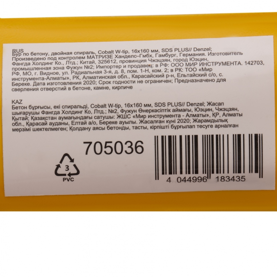 Бур по бетону Denzel арт. 705036 с хвостовиком SDS PLUS и двойной спиралью предназначен для сверления бетона, кирпича и камня. Он используется в качестве оснастки для перфораторов с патроном SDS Plus. Бур оптимален для проведения строительных, ремонтных, монтажных работ. Преимущества Продуманная конструкция — режущая твердосплавная пластина из стали ВК8 80-90 HRC с W-образной заточкой имеет высокий ресурс и способна сверлить отверстия до 30% быстрее, в том числе при работе с камнем. Прочность и износостойкость — рабочая часть из легированной стали 40Х выдерживает интенсивные и длительные ударные нагрузки, а также делает бур самым высокопроизводительным среди аналогов средней цены. Двойная спираль и канавка с дополнительным желобом — за счет более эффективного отвода шлама рабочая часть не перегревается, такая разработка позволяет продлить срок службы бура. Высокая технологичность — буры Denzel изготавливаются на производстве MAKITA, что гарантирует их качество и эффективность сверления. Бур поставляется в у