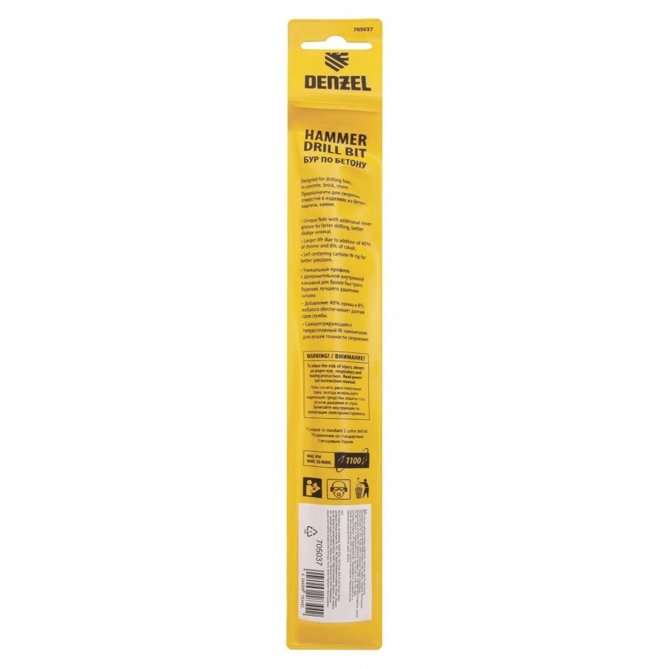 Бур по бетону Denzel арт. 705037 с хвостовиком SDS PLUS и двойной спиралью предназначен для сверления бетона, кирпича и камня. Он используется в качестве оснастки для перфораторов с патроном SDS Plus. Бур оптимален для проведения строительных, ремонтных, монтажных работ. Преимущества Продуманная конструкция — режущая твердосплавная пластина из стали ВК8 80-90 HRC с W-образной заточкой имеет высокий ресурс и способна сверлить отверстия до 30% быстрее, в том числе при работе с камнем. Прочность и износостойкость — рабочая часть из легированной стали 40Х выдерживает интенсивные и длительные ударные нагрузки, а также делает бур самым высокопроизводительным среди аналогов средней цены. Двойная спираль и канавка с дополнительным желобом — за счет более эффективного отвода шлама рабочая часть не перегревается, такая разработка позволяет продлить срок службы бура. Высокая технологичность — буры Denzel изготавливаются на производстве MAKITA, что гарантирует их качество и эффективность сверления. Бур поставляется в у