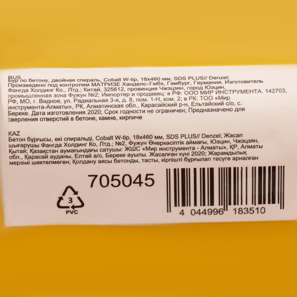 Бур по бетону Denzel арт. 705045 с хвостовиком SDS PLUS и двойной спиралью предназначен для сверления бетона, кирпича и камня. Он используется в качестве оснастки для перфораторов с патроном SDS Plus. Бур оптимален для проведения строительных, ремонтных, монтажных работ. Преимущества Продуманная конструкция — режущая твердосплавная пластина из стали ВК8 80-90 HRC с W-образной заточкой имеет высокий ресурс и способна сверлить отверстия до 30% быстрее, в том числе при работе с камнем. Прочность и износостойкость — рабочая часть из легированной стали 40Х выдерживает интенсивные и длительные ударные нагрузки, а также делает бур самым высокопроизводительным среди аналогов средней цены. Двойная спираль и канавка с дополнительным желобом — за счет более эффективного отвода шлама рабочая часть не перегревается, такая разработка позволяет продлить срок службы бура. Высокая технологичность — буры Denzel изготавливаются на производстве MAKITA, что гарантирует их качество и эффективность сверления. Бур поставляется в у