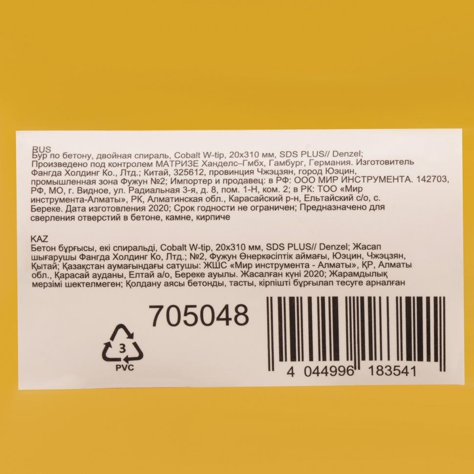 Бур по бетону Denzel арт. 705048 с хвостовиком SDS PLUS и двойной спиралью предназначен для сверления бетона, кирпича и камня. Он используется в качестве оснастки для перфораторов с патроном SDS Plus. Бур оптимален для проведения строительных, ремонтных, монтажных работ. Преимущества Продуманная конструкция — режущая твердосплавная пластина из стали ВК8 80-90 HRC с W-образной заточкой имеет высокий ресурс и способна сверлить отверстия до 30% быстрее, в том числе при работе с камнем. Прочность и износостойкость — рабочая часть из легированной стали 40Х выдерживает интенсивные и длительные ударные нагрузки, а также делает бур самым высокопроизводительным среди аналогов средней цены. Двойная спираль и канавка с дополнительным желобом — за счет более эффективного отвода шлама рабочая часть не перегревается, такая разработка позволяет продлить срок службы бура. Высокая технологичность — буры Denzel изготавливаются на производстве MAKITA, что гарантирует их качество и эффективность сверления. Бур поставляется в у