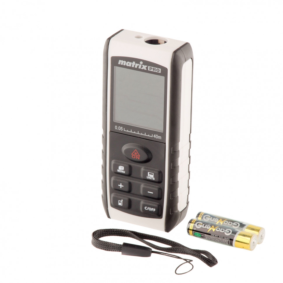 Лазерный дальномер Matrix LD-40 38015 с электронным угломером применяется для вычисления площади и объема помещения, замера углов и определения длины до 40 м. Для ускорения и облегчения работы предусмотрена возможность складывания и вычитания полученных результатов. Прибор можно использовать как в помещении, так и на улице, поэтому он подходит для проведения строительных, ремонтных, отделочных, а также дорожных и геодезических работ. Надежность и долговечность — корпус выполнен из ударопрочного ABS-пластика.
