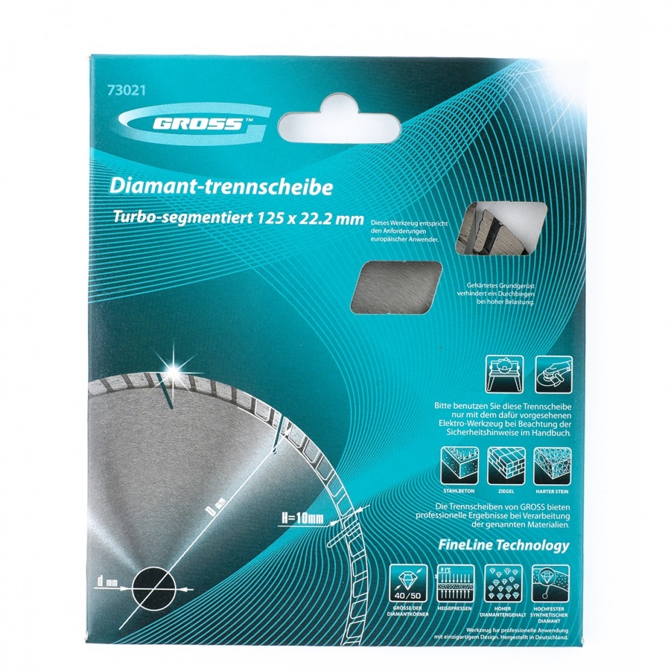 Алмазный турбо-сегментный диск Gross ф230х22,2 мм 73026 для сухого резания устанавливается на УШМ в качестве оснастки для проведения отрезных работ. Диск с турбированной рабочей частью универсален по своему применению и его можно использовать для резки камня, гранита и кирпича, свежего бетона, а также слабоармированного железобетона. Он пригодится для интенсивных работ с профессиональным инструментом.Преимущества Турбо-сегментная форма &mdash резание материалов происходит быстро, водяное охлаждение не требуется, в т.ч. армированного бетона. Надежность &mdash диск выполнен методом горячего прессования. Износостойкость и скорость реза до 6650 об/мин &mdash режущая часть выполнена из крупных алмазов размером 40-50 мкм. Рабочая часть 10 мм с высокой концентрацией алмазных зерен &mdash диск идеально подходит для выполнения больших объемов работ. Оптимально подобранная металлическая связка &mdash серебро, кобальт и другие составляющие значительно повышают ресурс диска, позволяют резать материалы разной плотности.