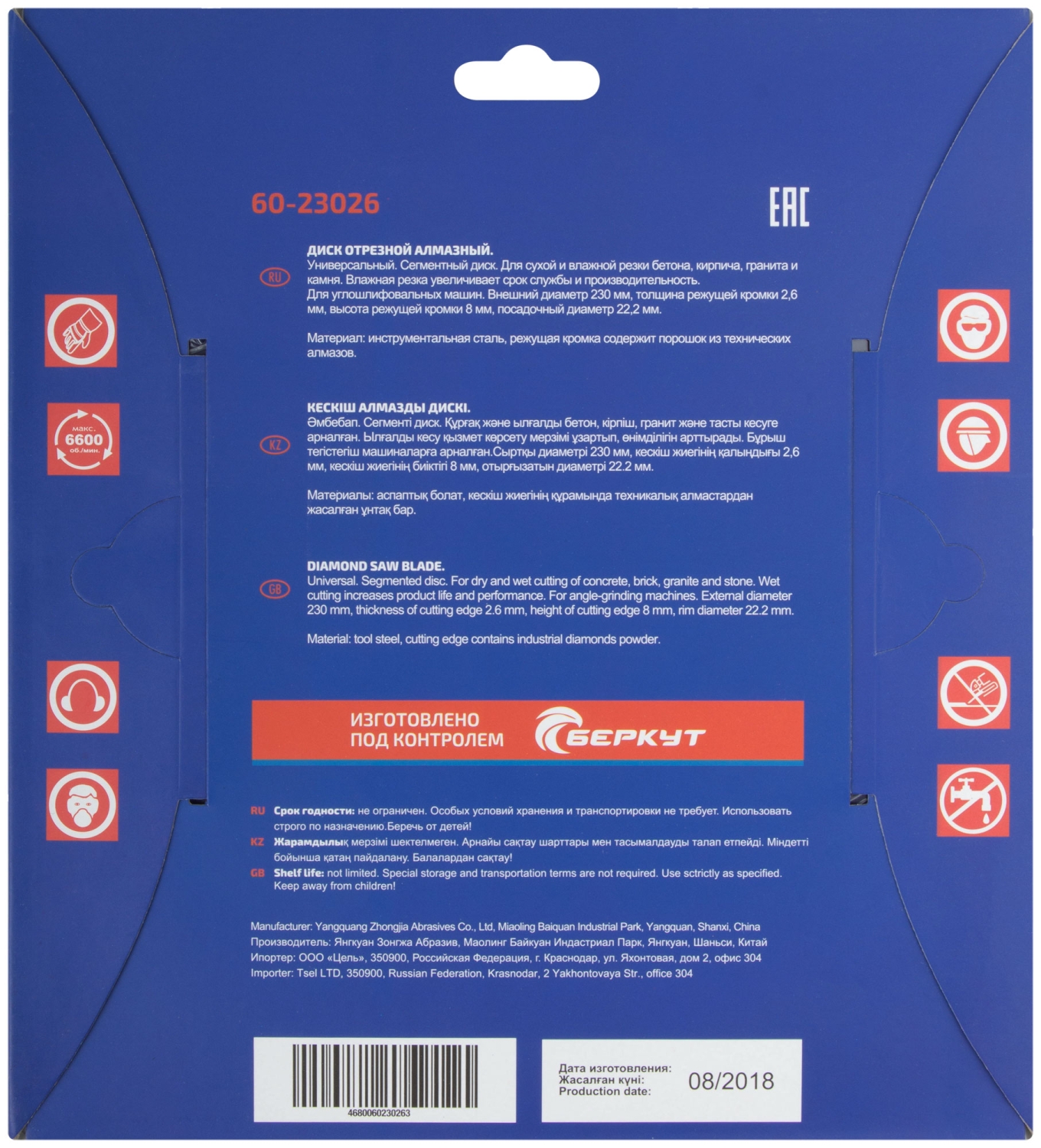 Сегментный. Универсальный. Для сухой и влажной резки бетона, кирпича, гранита, мрамора и камня. Посадочный диаметр 22,2 мм. <br/>Материал: инструментальная сталь, режущая кромка содержит порошок из технических алмазов. <br/>Упаковка: картонный конверт.