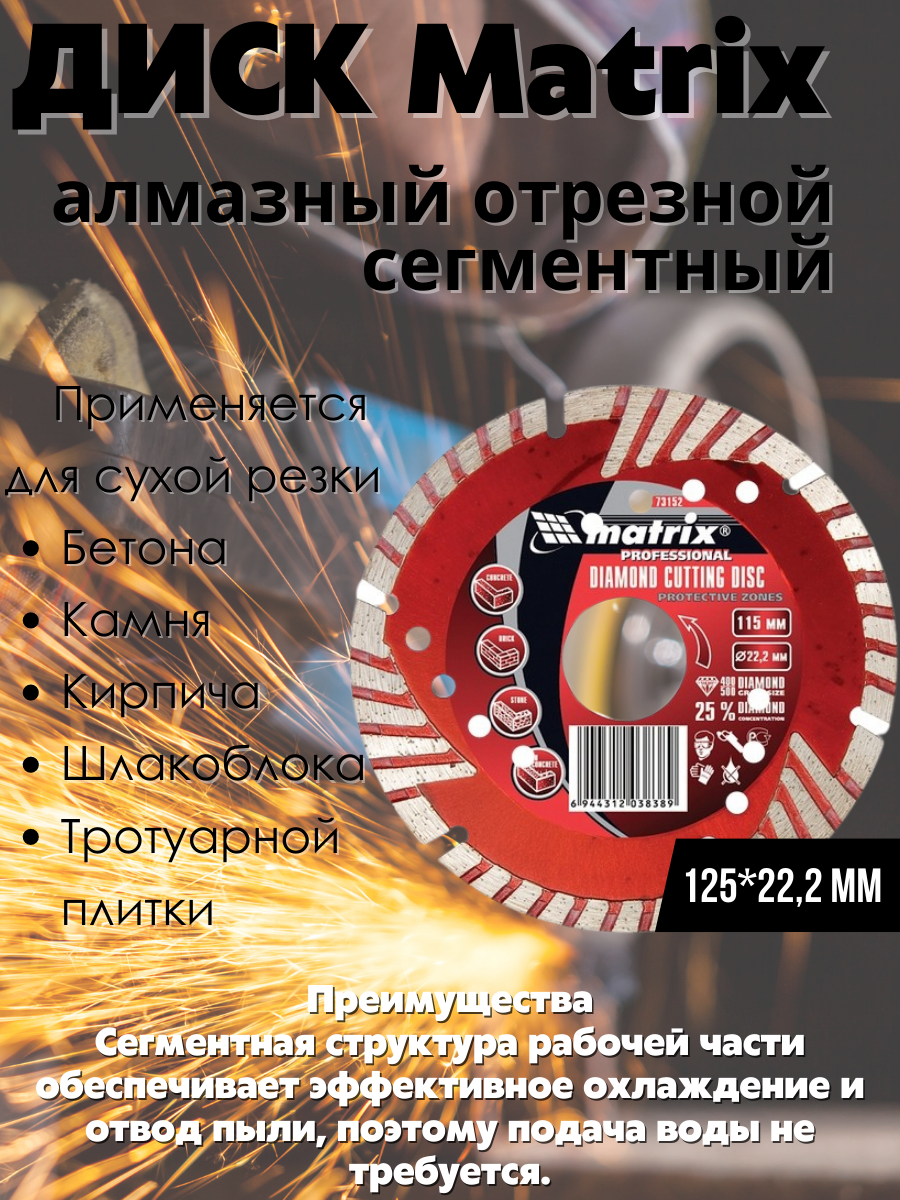 Диск алмазный отрезной сегментный Matrix 73155 с защитными секторами, 180 х 22,2 мм, применяется для сухой резки бетона разной прочности, камня, кирпича, шлакоблока и тротуарной плитки. Он используется как оснастка для углошлифовальных машин с соответствующим посадочным диаметром. Диск изготовлен методом холодного прессования и выдерживает повышенные нагрузки при прохождении арматуры в слабоармированном железобетоне.Преимущества Сегментная структура рабочей части обеспечивает эффективное охлаждение и отвод пыли, поэтому подача воды не требуется. Защитные секторы предохраняют сегменты диска от преждевременного износа и от налипания шлама. За счет уникальной формы диск позволяет выполнять кратковременную обработку боковой поверхностью без риска поломки. Увеличенная концентрация алмазов и специально подобранная металлическая связка обеспечивают высокий ресурс диска. Благодаря ширине рабочей части 7 мм диск успешно справляется с бытовыми задачами.