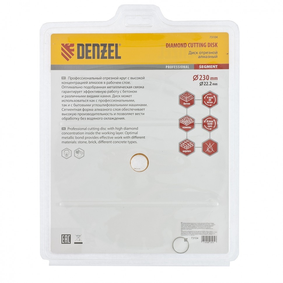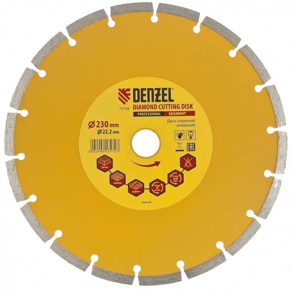 Отрезной алмазный диск Denzel Сегментный ф230 х 22,2 мм 73104 используется для сухого резания по свежему и старому бетону, камню, кирпичу, шлакоблоку, мрамору, тротуарной плитке. Он применяется в качестве сменного инструмента с профессиональными и бытовыми УШМ. Диск сегментного типа отличается высокой производительностью даже при интенсивных нагрузках, не требует водяного охлаждения.Преимущества Эффективность реза плотных материалов обеспечивает сбалансированная металлическая связка, устойчивая к перегреву и перегрузкам. Рабочая часть с высококонцентрированным алмазным слоем шириной 7 мм повышает скорость реза и износостойкость диска. Диск разделен на сегменты, что способствует хорошему отводу пыли во время работы. Изготовление по технологии холодного прессования позволяет добиться хороших режущих свойств диска.