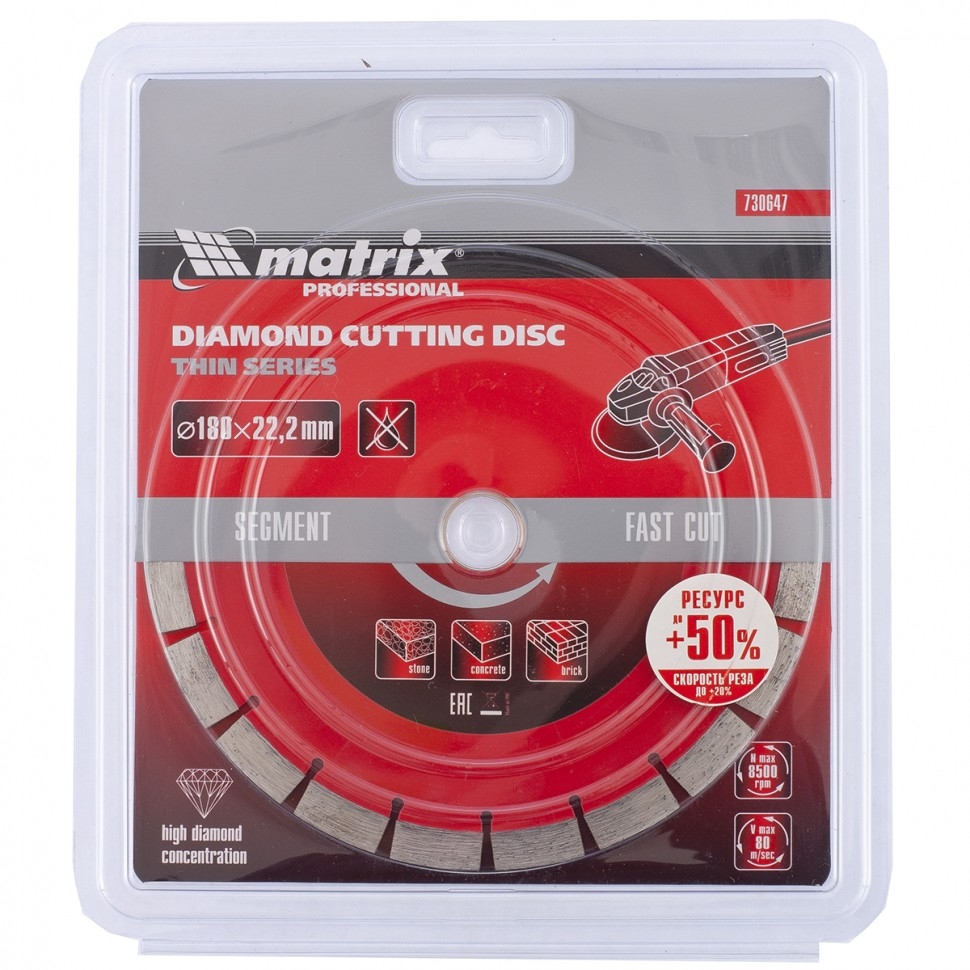 Отрезной сегментный алмазный диск Matrix ф180х22,2 мм 730647, тонкий, позволяет проводить сухое резание свежего и старого бетона, камня, гранита, шлакоблока, тротуарной плитки, песчаника и кирпича с помощью УШМ. Его можно использовать как в частной мастерской, так и на стройке для решения профессиональных задач. Тонкий корпус диска способствует снижению нагрузки на инструмент, позволяя ускорить рабочий процесс на 20%.Преимущества 20 сегментов позволяют быстро проводить работы по различным материалам без водяного охлаждения диска. За счет ширины режущего слоя 10 мм и высокой концентрации алмазов диск быстро разрезает материалы без риска преждевременного износа. Плотная металлическая связка отлично удерживает алмазы, обеспечивая их равномерное истирание, своевременную раскрываемость и полную выработку. Технология ускоренного горячего прессования делает диск устойчивым к высоким нагрузкам и износу.