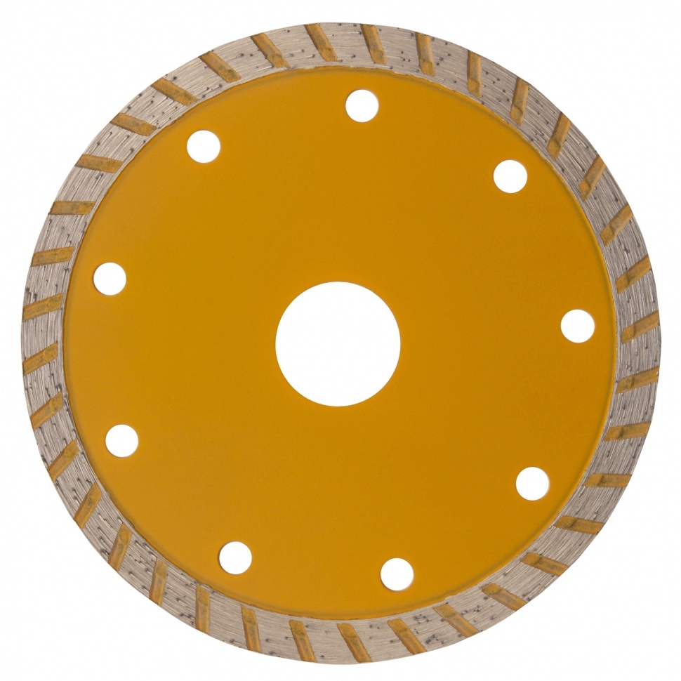 Отрезной алмазный диск Denzel Турбо ф115 х 22,2 мм 73106 рассчитан на сухое резание камня, кирпича, свежего и затвердевшего бетона, железобетона. Он используется в качестве оснастки на УШМ с посадочным отверстием 22,2 мм при проведении бытовых и профессиональных отрезных работ. Турбо диск режет снижает ударную нагрузку при резании материалов и не требует водяного охлаждения.Преимущества Качественная металлическая связка обеспечивает эффективность работы с плотными материалами, т.к. устойчивая к высоким температурам. Режущий слой шириной 7 мм с высокой концентрацией алмазов позволяет увеличить скорость реза и износостойкость диска. Диск изготовлен по технологии холодного прессования, поэтому отличается хорошими режущими свойствами.