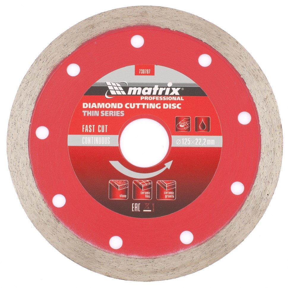 Отрезной сплошной алмазный диск Matrix ф125х22,2 мм 730787, тонкий, обеспечивает мокрое резание плотных материалов: керамогранита, керамической и кафельной плитки, мрамора, натурального и искусственного камня. Он устанавливается на УШМ или плиткорезы и используется с применением водяного охлаждения. Диск увеличивает производительность на 20% благодаря небольшой толщине 1,5 мм и снижению нагрузки на инструмент.Преимущества Сплошная форма и перфорированный корпус позволяют добиться высокого качества реза и предотвращают появление сколов. Режущая часть шириной 10 мм с высокой концентрацией алмазов способствуют увеличению рабочего ресурса диска на 50%. Высокий ресурс и износостойкость рабочей части достигается за счет металлической связки. Метод ускоренного горячего прессования улучшает сопротивление режущей части нагрузкам и делает мокрое резание более качественным. Диск может использоваться в бытовых целях и профессионально.