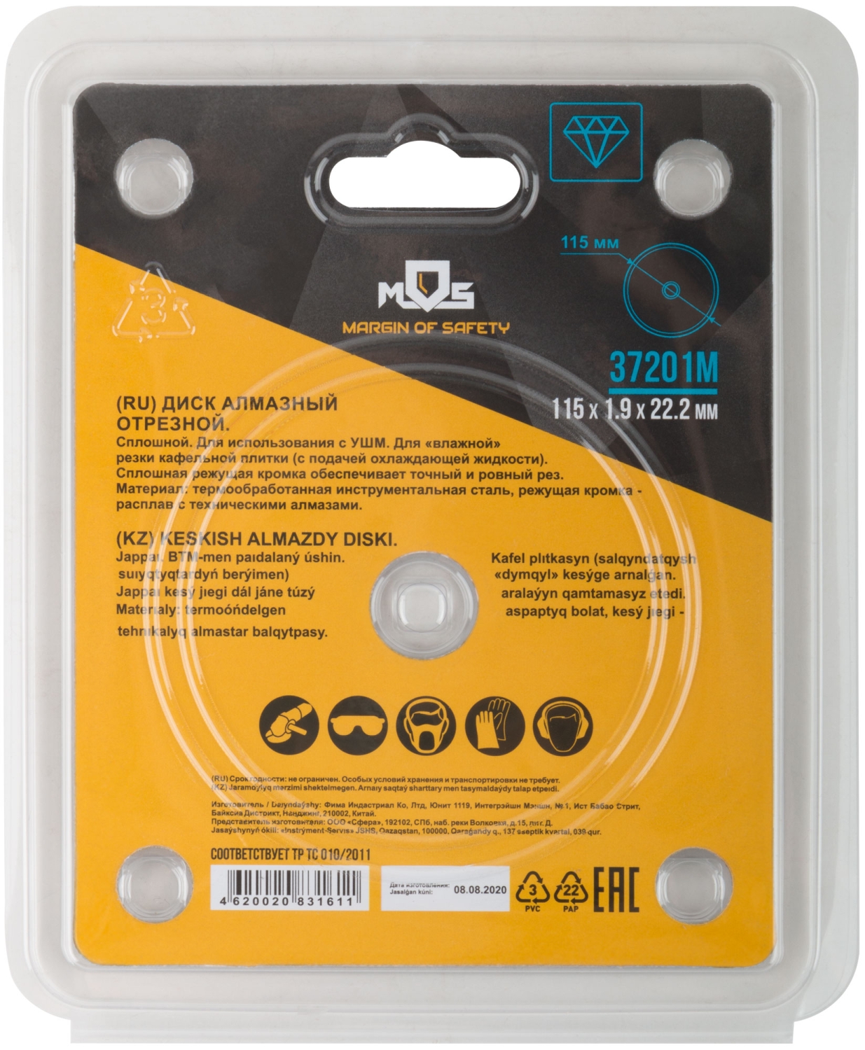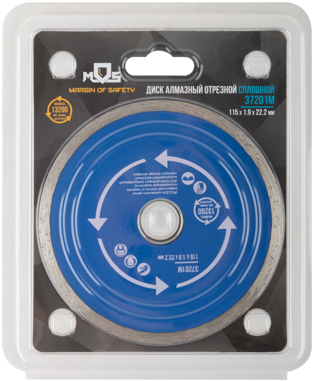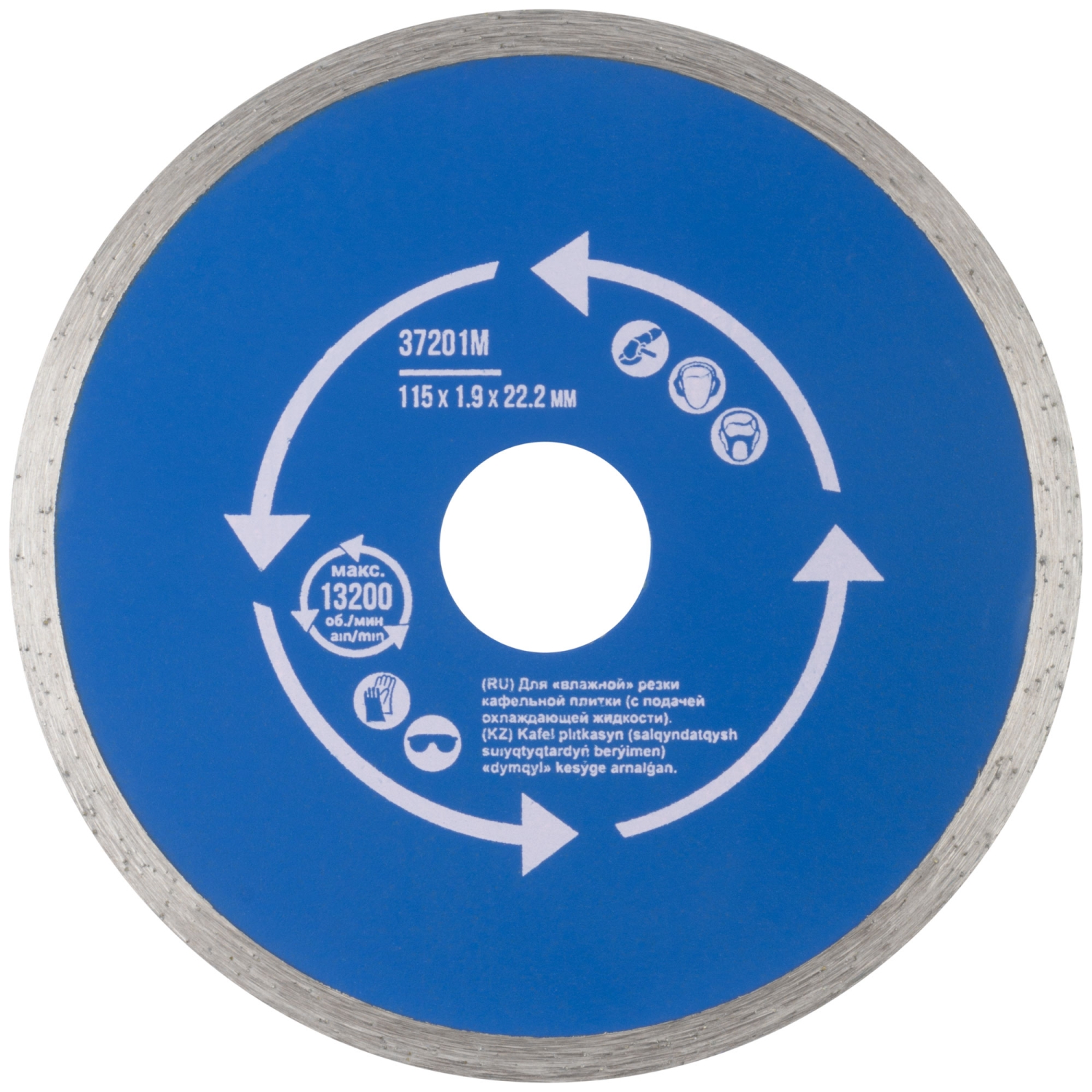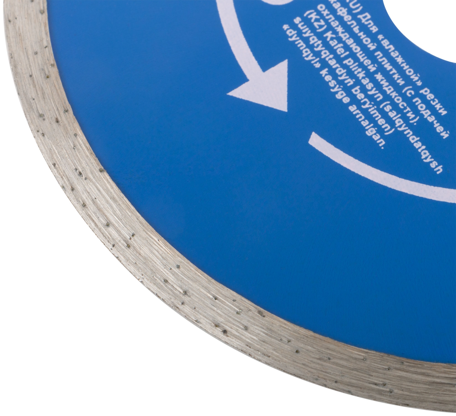 Сплошной. Для использования с УШМ. Посадочный диаметр 22,2 мм. Для "влажной" резки кафельной плитки (с подачей охлаждающей жидкости).<br/>Сплошная алмазная режущая кромка, высотой 5 мм, обеспечивает точный и ровный рез. Материал: инструментальная сталь, режущая кромка - расплав<br/>с техническими алмазами. Упаковка: блистер.