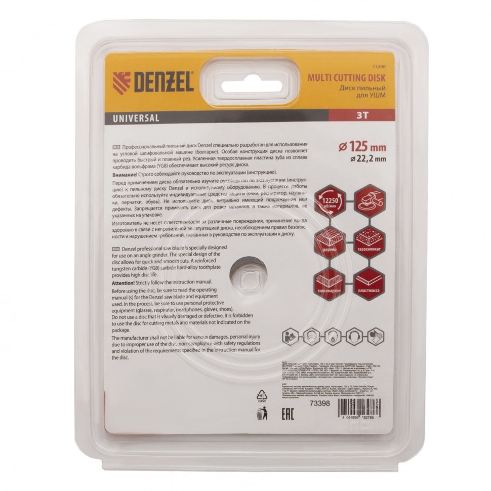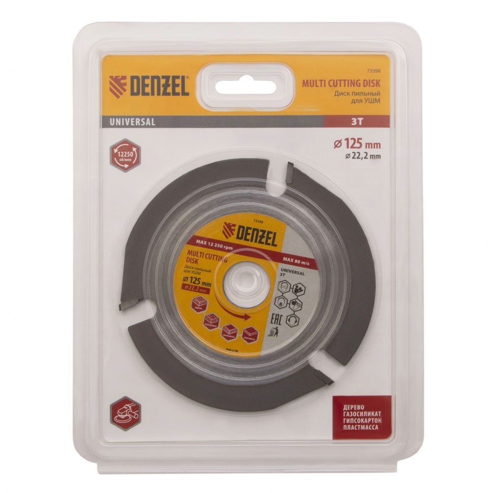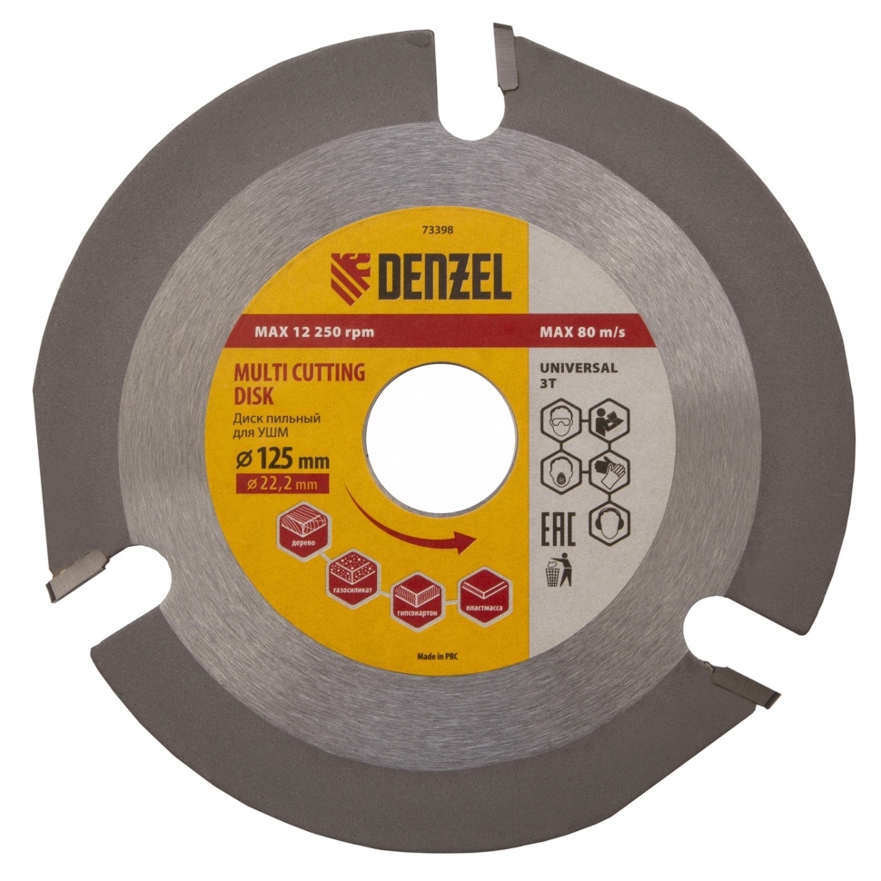 Пильный диск для УШМ Denzel Мультирез 73398, 125 х 22,2 мм, позволяет быстро распилить древесину, тонкий пластик, гипсокартон и газосиликат. Является оснасткой для углошлифовальных машин, что делает его универсальным. Будет полезен как профессиональным мастерам, так и домашним умельцам. Перед эксплуатацией необходимо изучить инструкцию как диска, так и углошлифовальной машины. Преимущества Диск имеет высокий рабочий ресурс благодаря усиленным режущим пластинам из высокотвердого сплава карбида вольфрама YG8. Особая форма режущих пластин позволяет делать поперечные выборки древесины и других материалов. За счет продуманной геометрии диск быстро и плавно режет материалы без рывков, обеспечивая высокое качество работ. Прочный корпус не деформируется даже при интенсивном использовании.