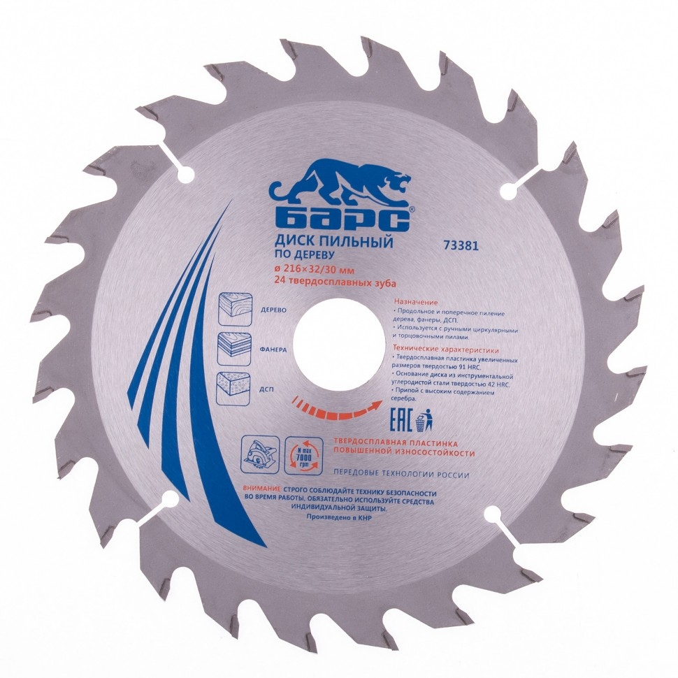 Пильный диск Барс 73381, ф216 х 32 мм, с 24 зубьями и кольцом 32/30 мм предназначен для быстрого пиления древесины мягких и твердых пород, ДСП, МДФ и фанеры. Тип зубьев АТВ и оптимально подобранный угол зуба позволяют производить как продольный, так и поперечный распил. Диск используется совместно с торцовочными и циркулярными пилами с посадкой 32 мм. В комплект входит переходное кольцо на диаметр 30 мм, расширяющее возможности применения оснастки. Диск подходит для интенсивной эксплуатации и может использоваться в профессиональной сфере. Повышенная износостойкость - пластины изготовлены из сплава YG8 твердостью свыше 88 HRА с добавлением легирующих компонентов, формирующих мелкозернистую структуру материала.