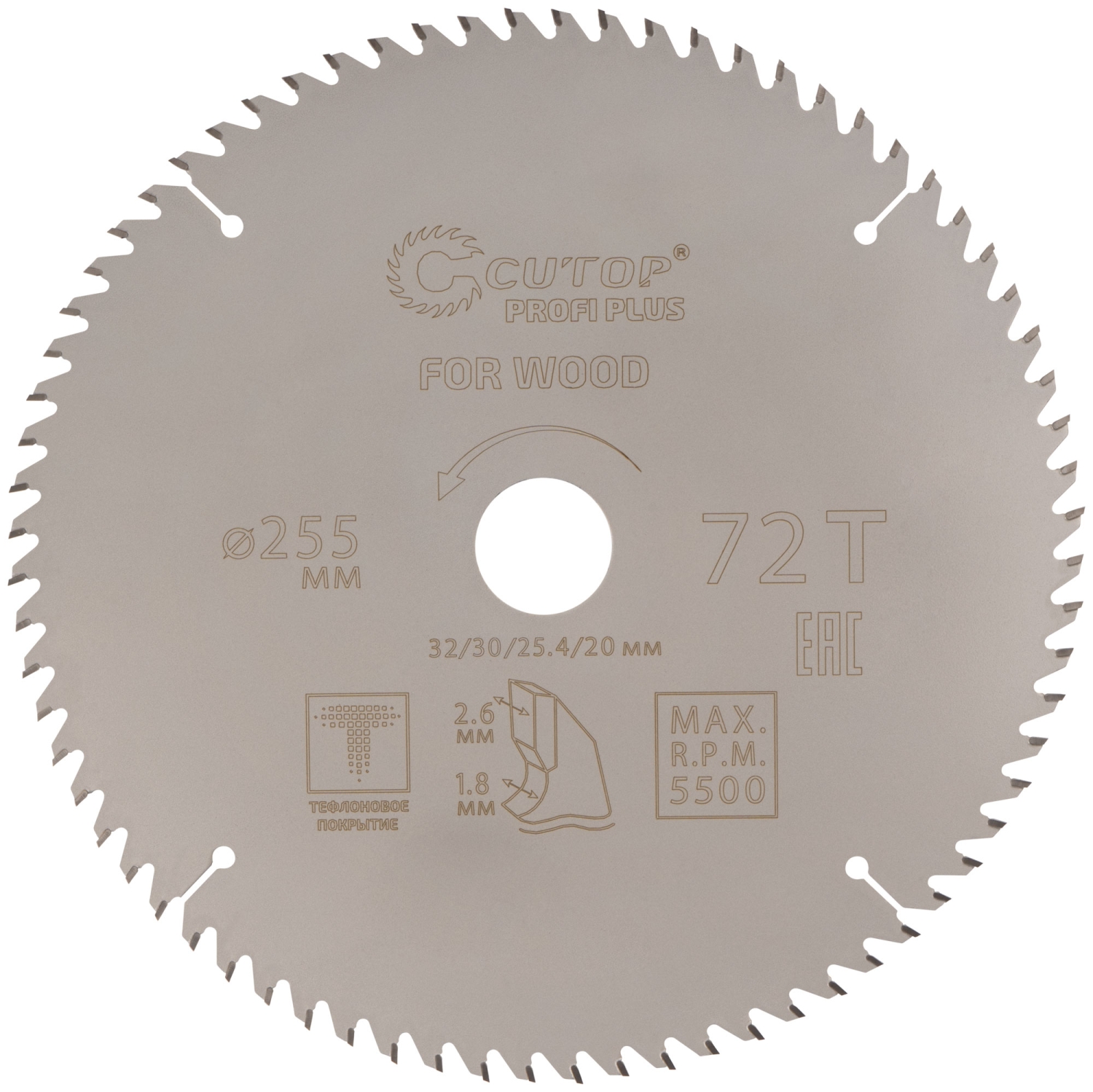 Диск пильный по дереву с тефл.покр.72Т CUTOP Profi Plus 255х1,8/2,6х32/30/25,4/20 мм