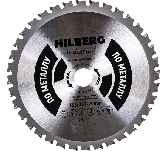 Диск пильный Hilberg Industrial (165х20 мм; 36Т) Hilberg HF165 применяется с монтажной дисковой (циркулярной) пилой для чистого и точного реза по металлу, стали, чугуну.