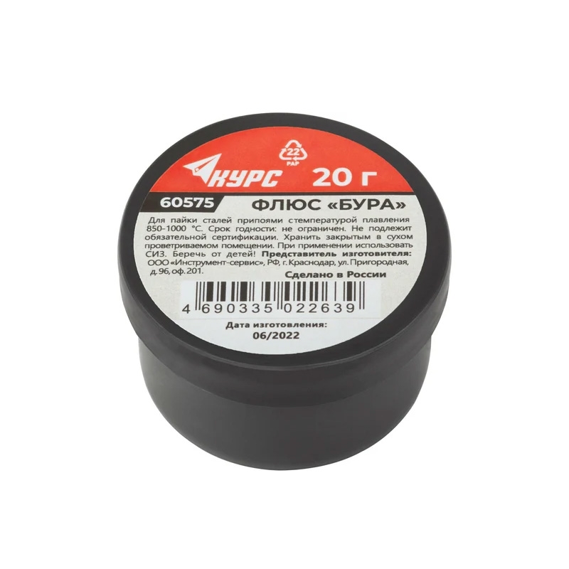 Флюс Бура активный для высокотемпературной пайки, баночка 20гр. является высокотемпературный флюс. Натрия тетраборат. Для пайки нержавеющих и жаропрочных сталей, чугуна, меди припоями с температурой плавления 850-1000 С.