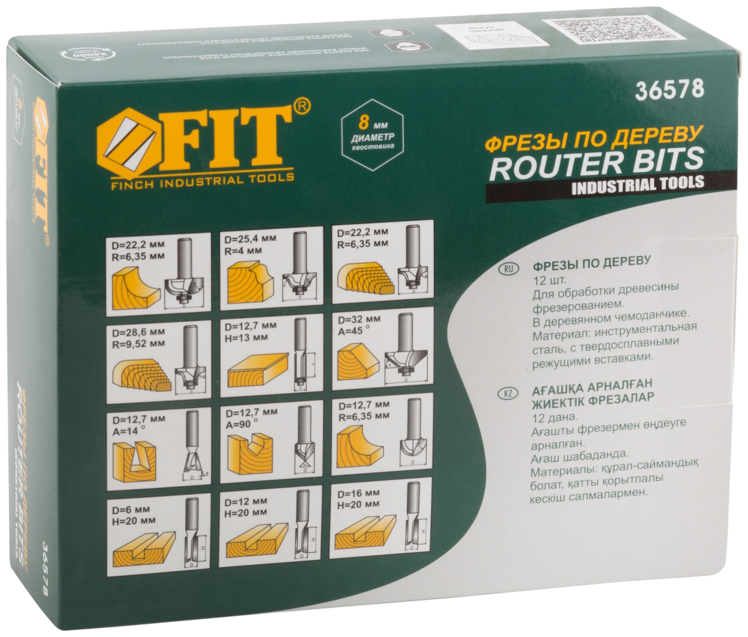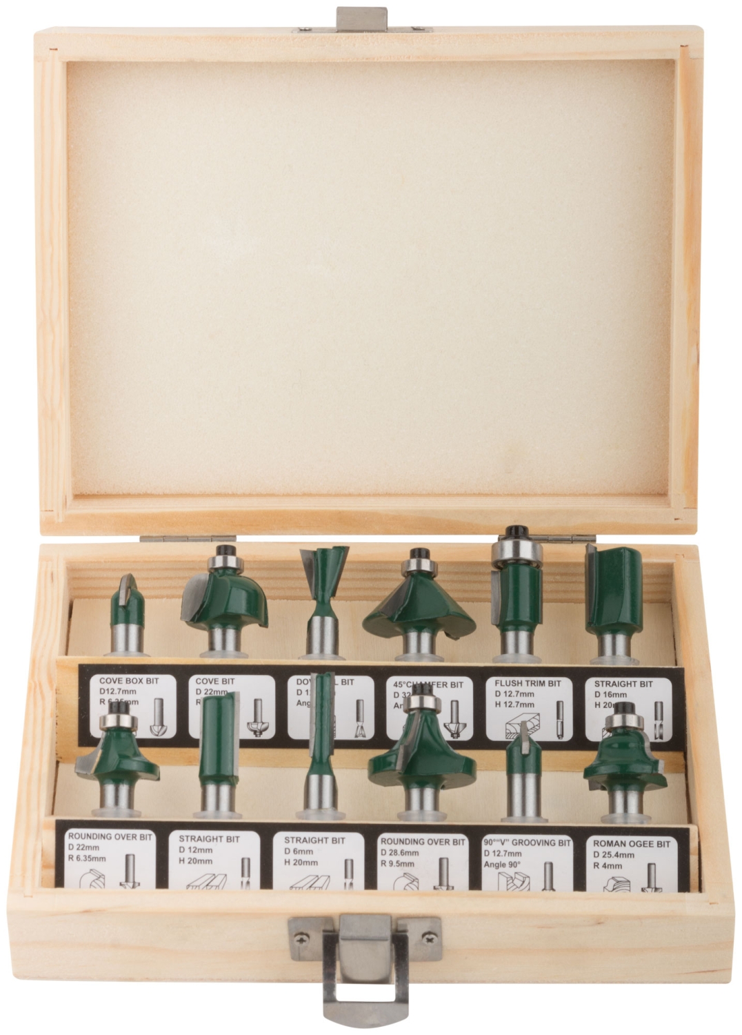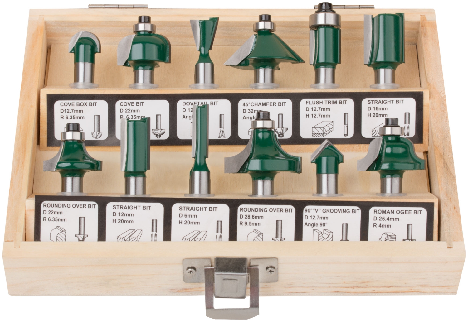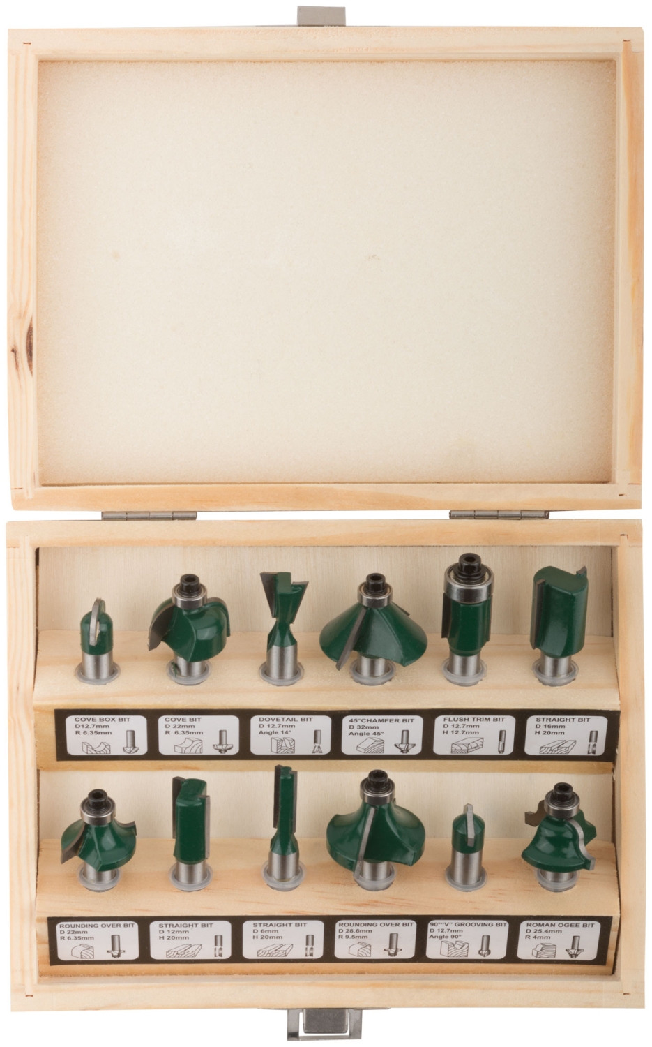 Фрезы по дереву кромочные, набор 12шт., дерев.бокс, хвостовик 8 мм