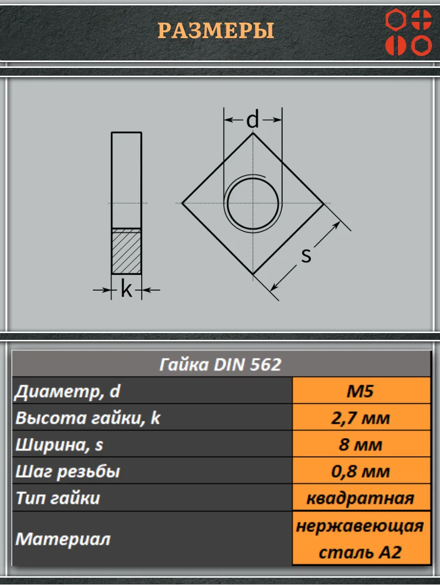 Гайка квадратная М5 нержавеющая низкая DIN562, 10 шт.