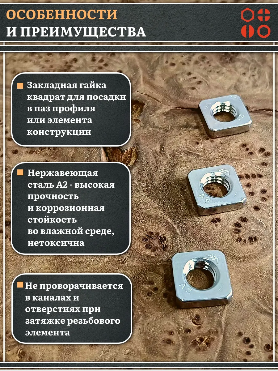 Гайка квадратная М5 нержавеющая низкая DIN562, 4 шт.