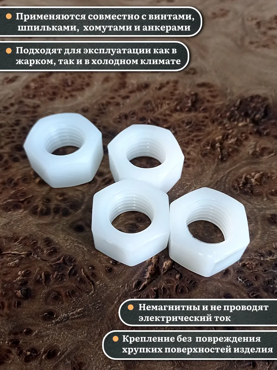 Гайки из пластика, изготовленные из полиамида и соответствующие стандарту DIN 934, используются для предотвращения самопроизвольного раскручивания резьбовых соединений. Вместе с ними применяют полиамидные шайбы, которые служат в качестве уплотнительной прокладки. Это позволяет увеличить площадь контакта и защитить соединяемые детали от повреждений.