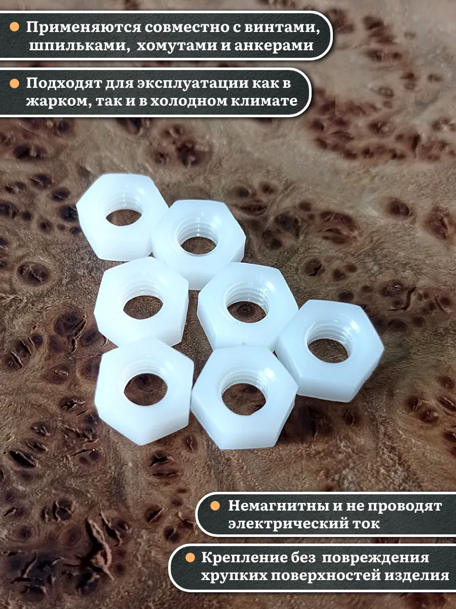 Гайки из пластика, изготовленные из полиамида и соответствующие стандарту DIN 934, используются для предотвращения самопроизвольного раскручивания резьбовых соединений. Вместе с ними применяют полиамидные шайбы, которые служат в качестве уплотнительной прокладки. Это позволяет увеличить площадь контакта и защитить соединяемые детали от повреждений.
