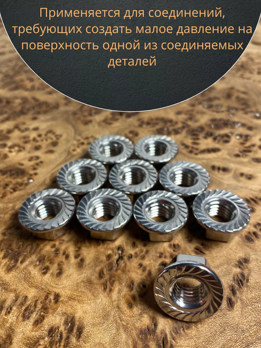 Гайка с фланцем это обычная шестигранная гайка в нижней части которой выполнено уширение (буртик) с насечками или без них. Применение гаек с фланцем значительно ускоряет процесс сборки, поскольку не требуется время на подкладывание шайбы. Фланец по диаметру больше гайки. Фланцевые гайки находят широкое применение в автомобилестроении, при производстве бытовых инструментов и техники, оборудования для пищевой, химической промышленности. Крепеж изготавливается из нержавейки А2 или А4, могут подвергнуть газотермическому цинкованию.