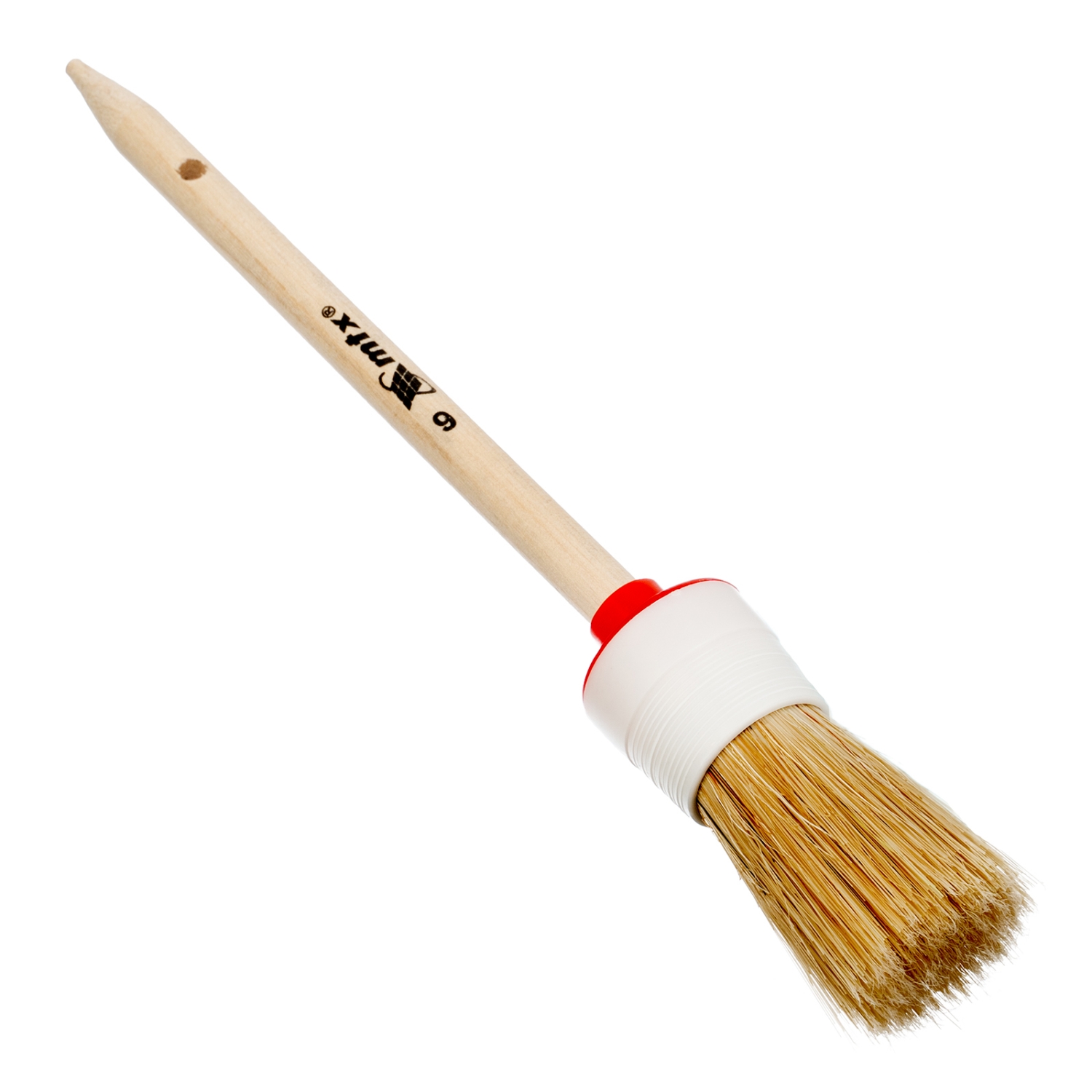 Круглая кисть MTX №6 82076 диаметром 30 мм, с натуральной щетиной и деревянной ручкой, пригодится в быту для окрашивания узких длинных поверхностей. Светлая натуральная свиная щетина с добавлением искусственной обладает высокой износоустойчивостью и может использоваться для нанесения красок с содержанием растворителей, а также масляных красок и лаков.