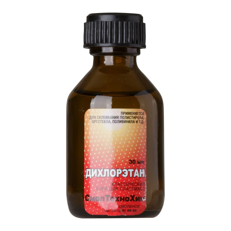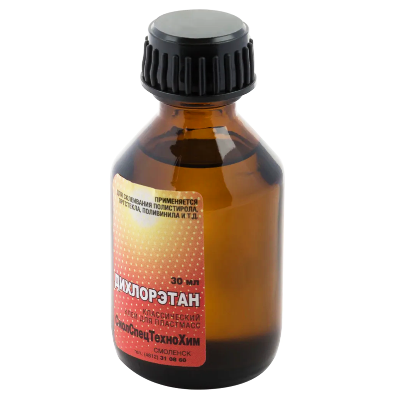 Клей для пластмасс ДХЭ 30 мл, флакон-стекло предназначен для склеивания корпусных поверхностей из пластмассы (изделия из оргстекла, полистирола или полиметилметакрилата (ПММА)), для использования в производстве в качестве растворителя (в составе красок, средств для снятия лака, полирующих средств), а также как средство для обезжиривания различных материалов (растворяет жиры, воск, смолы, входит в состав пятновыводителей).