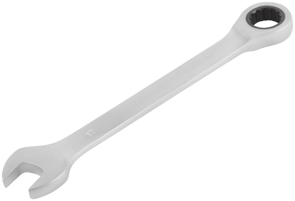 Ключ комбинированный трещоточный, crv реверсивный механизм 17 Трещоточный механизм 72 зуба – минимальный угол поворота 5°. 12 гранный профиль накидной части обеспечивает надежный захват крепежных элементов и снижает риск их деформации. Материал: термообработанная инструментальная сталь, реверсивный механизм из хром-ванадиевой стали. Упаковка: пластиковый подвес.мм