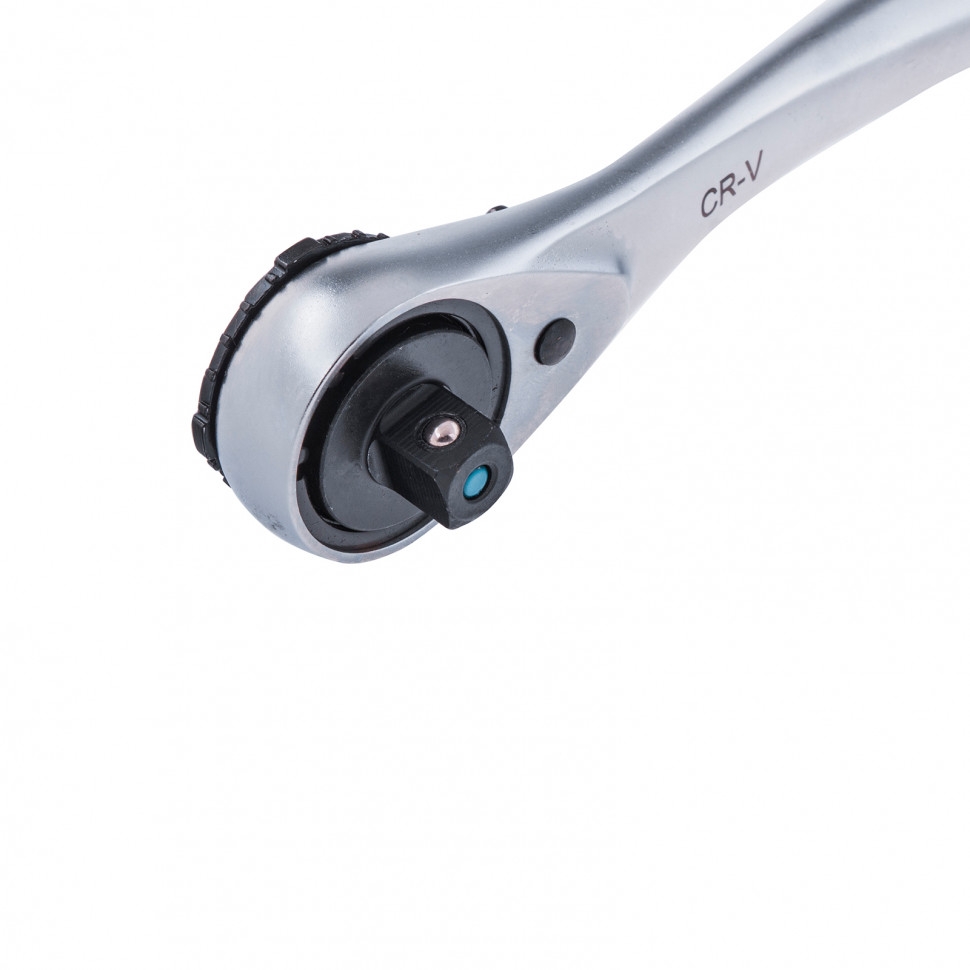 Трещоточный ключ Gross 14136 с присоединительным квадратом 3/8 дюйма предназначен для работ с резьбовыми соединениями. Храповый механизм со 120 зубцами обеспечивает исключительно плавный ход. Инструмент оптимален для работы с труднодоступными крепежами — шаг трещотки составляет всего 3 градуса. Ключ подойдет для ремонта компактной техники, велосипедов, монтажа оборудования, пригодится также дома, в гараже или на даче. Преимущества Ключ изготовлен из высококачественной стали хромованадиевой группы и имеет цельнокованый корпус, что обеспечивает повышенную прочность и износостойкость инструмента. Во время работы насадка надежно удерживается присоединительным квадратом 3/8 дюйма с шариковым фиксатором. Ключ снабжен кнопкой быстрого сброса, позволяющей заменить насадку за несколько секунд. При помощи флажкового переключателя можно моментально изменить направление вращения трещотки. Механизм свободного вращения упрощает работу с крепежными элементами. Рукоятка оригинальной формы обеспечивает комфортность использо