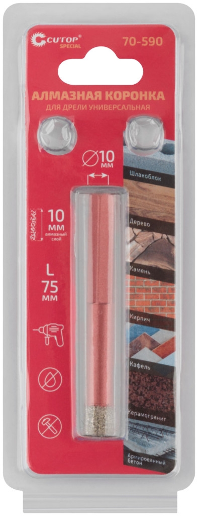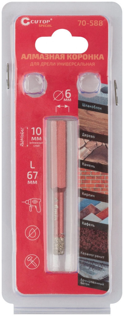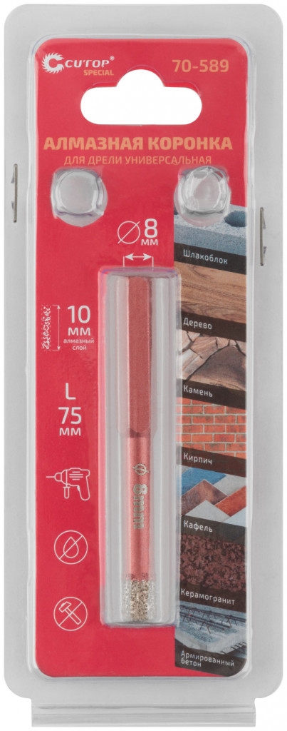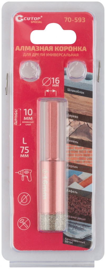 Коронка алмазная универсальная с шестигранным хвостовиком предназначена для дрели. Применяется для сухого сверления керамогранита, мрамора, шлакоблока, кирпича, плитки, стекла, дерева и т д. Внутри коронок используется специальный охлаждающий материал(воск), что значительно увеличивает ресурс. Материал: инструментальная сталь, технические алмазы, воск. Упаковка: блистер.
