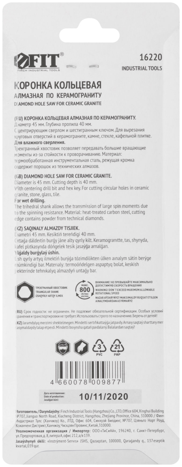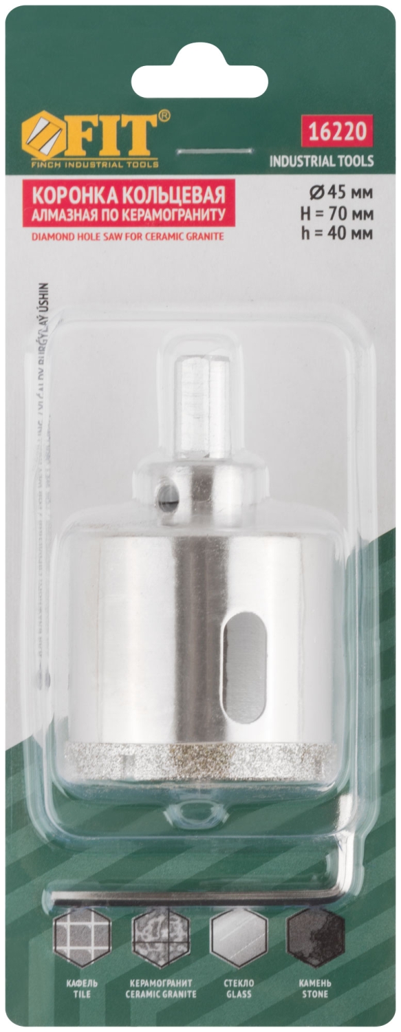 | Коронка по керамограниту, камню и кафелю кольцев с центров сверлом 45х67 мм | 16220 | 1 шт. |