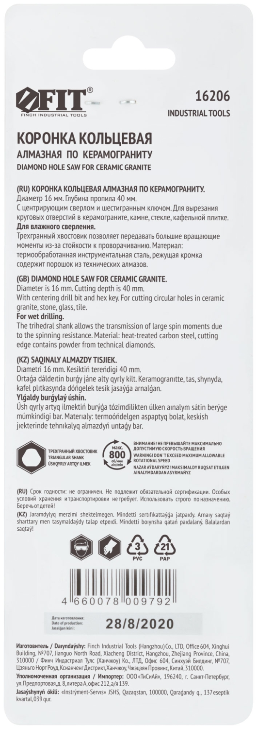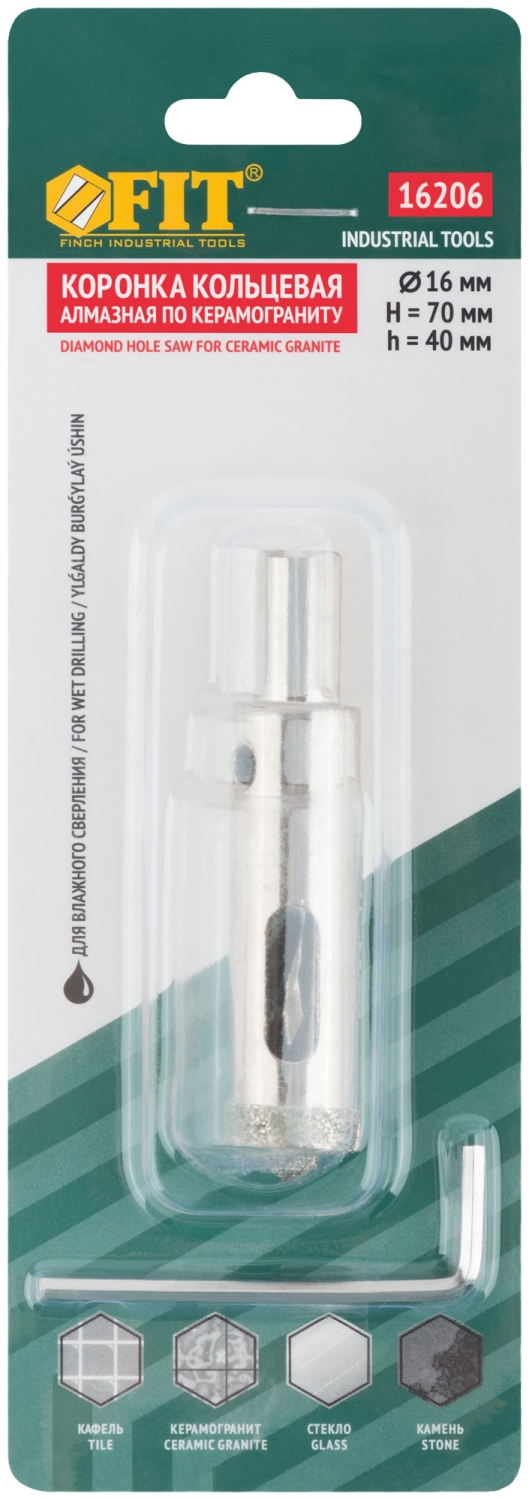 | Коронка по керамограниту, камню и кафелю кольцев с центров сверлом 16х70 мм | 16206 | 1 шт. |