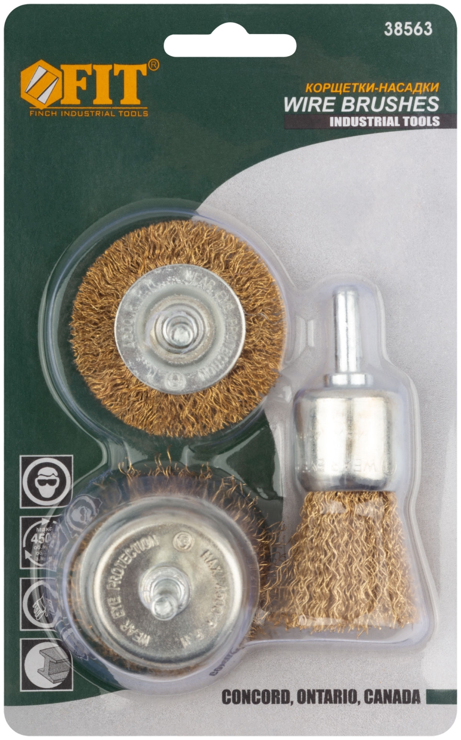 Набор 3 шт. Материал: стальная, латунированная, волнистая проволока. Упаковка: блистер. Набор корщеток FIT IT 3 шт, колесо 50мм, чашка 50мм, венчик 25мм 38563 предназначены для снятия старой краски и ржавчины. Набор обеспечивает обработку различных поверхностей, в том числе в труднодоступных местах. Для продолжительного срока службы щетина выполнена из латунированной стальной проволоки.
