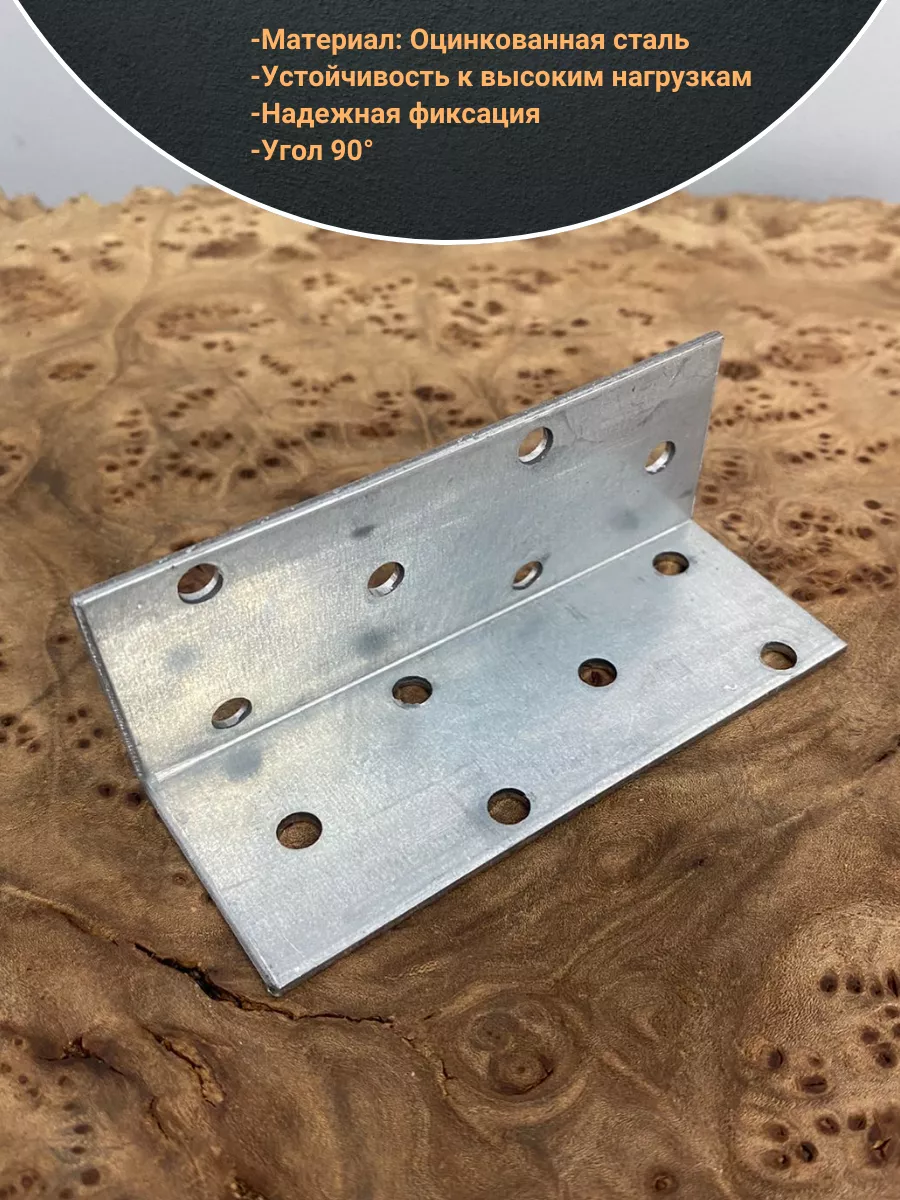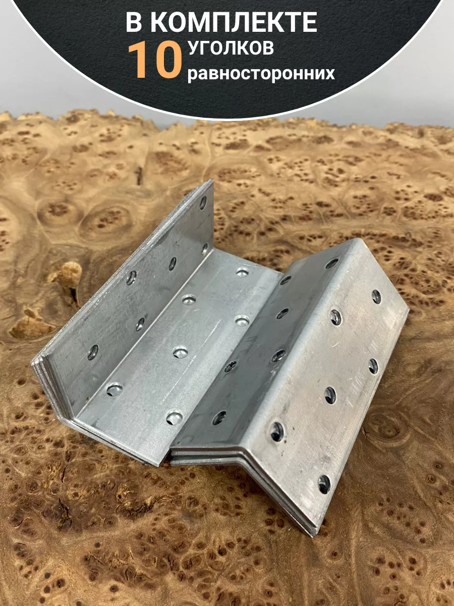 Равносторонний перфорированный уголок представляет собой стальную пластину, изогнутую под углом 90°, с отверстиями одинакового диаметра под многоточечный монтаж с помощью саморезов и гвоздей. Применяется в мебельном производстве, для соединения деревянных конструкций между собой и к основанию из дерева и металла, может использоваться для крепления балок, монтажа нагруженных несущих элементов из массивного бруса. Изготовлен из конструкционной стали с цинковым покрытием, обеспечивающим защиту от коррозии.