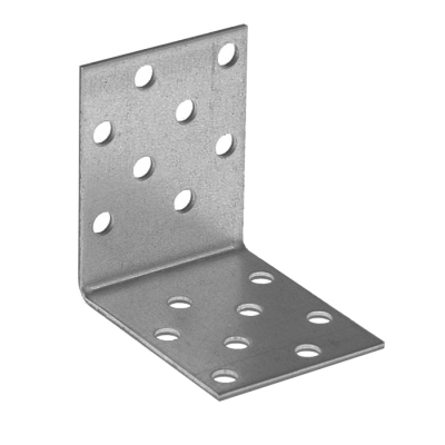 Равносторонний перфорированный уголок представляет собой стальную пластину, изогнутую под углом 90°, с отверстиями одинакового диаметра под многоточечный монтаж с помощью саморезов и гвоздей. Применяется в мебельном производстве, для соединения деревянных конструкций между собой и к основанию из дерева и металла, может использоваться для крепления балок, монтажа нагруженных несущих элементов из массивного бруса. Изготовлен из конструкционной стали с цинковым покрытием, обеспечивающим защиту от коррозии.