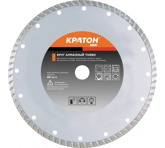 Круг алмазный TURBO HOBBY Кратон 1 08 03 007 предназначен для сухого и мокрого реза бетона, кирпича, камня. Имеет турбированную рабочую поверхность, что обеспечивает высокую производительность.Для резки бетона, кирпича, керамики, гранита, камня, мрамора.