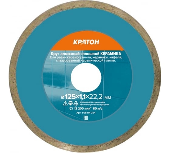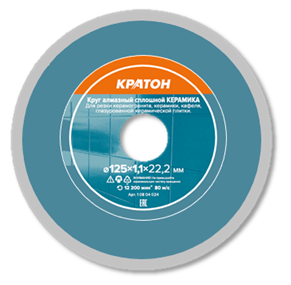 Алмазный круг марки Кратон Профи 125 мм используется для ручных угловых шлифмашин, плиткорезов и алмазной пилы по камню. Он аккуратно обрабатывает керамическую плитку и черепицу, поверхность остается гладкой. С алмазным кругом осуществляется мокрая резка, которая является эффективной при работе с керамикой. Отрезная кромка нанесена методом серебряной пайки, благодаря чему оснастка может использоваться продолжительное время. Универсальный круг подойдет для различных материалов, таких как керамика, керамогранит.