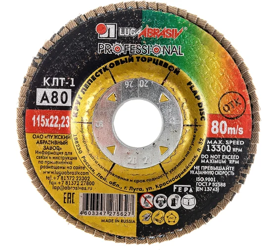 Круг лепестковый торцевой плоский КЛТ1 (150х22 мм; А 80; 14А 20/Р80) Луга D91015022140200 предназначен для ручных шлифовальных машин. Применяется для плоского шлифования, обработки кромок и сварных швов деталей и конструкций из различных марок сталей, цветных металлов и древесины. Круг работает тихо, устойчиво, без прижогов, оставляя холодными обработанные поверхности, обеспечивает максимальный съем материала.