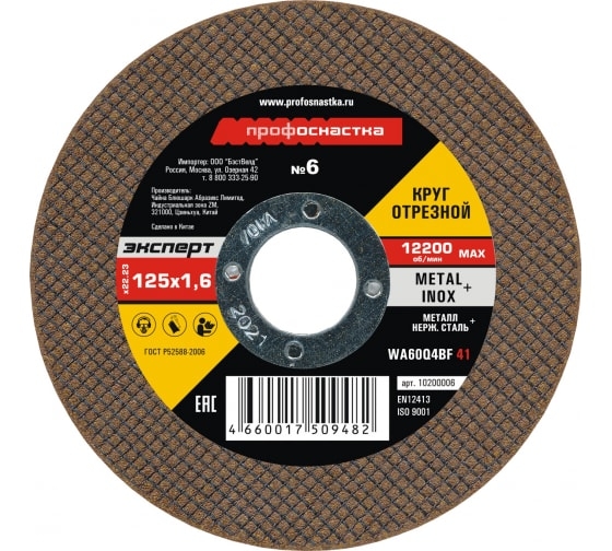 Отрезной круг №6 125*1,6*22 мм тип 41 ТМ Профоснастка предназначен для использования на УШМ. Обеспечивает мягкий рез и имеет высокий коэффициент шлифования (более 1,8) – показатель долговечности ресурса резания. Так же, с учетом цены отрезного диска и его ресурса, низкий показатель стоимости одного реза является наиболее выгодным для сравнения при интенсивном или индустриальном применении. Рекомендуется для резания углеродистых и нержавеющих сталей.