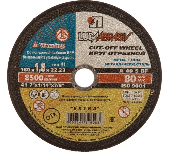 Круг отрезной мет+нерж 180х1,4х22 мм A 40 S BF 80 Луга D11001802214000 1 шт.