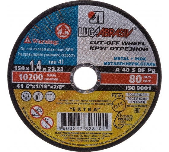 Круг отрезной мет+нерж 150х1,4х22 мм A 40 S BF 80 Луга D11001502214000 1 шт.