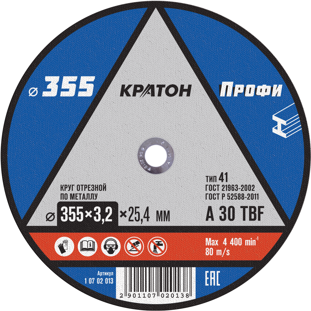 Круг отрезной большого диаметра Кратон «Профи» A30TBF 355х3,2х25,4 мм предназначен для резки металлических заготовок и применяется в качестве расходного режущего элемента для угловых шлифовальных машин ручного применения. Может быть использован для работы с цветным металлом, стальными конструкциями и чугуном. Изделие представляет собой абразивный диск плоского типа 41 с сбалансированностью посадочного кольца. Слой абразива связан синтетической смолой бакелитом. Показатели прочности увеличены за счет армирования спецсеткой.