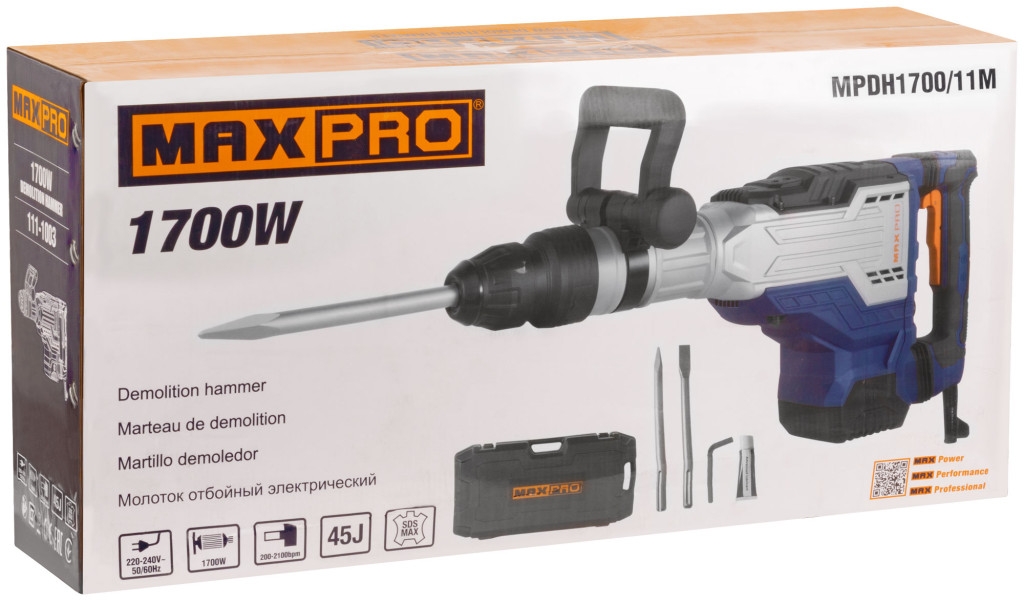 Молоток отбойный 1700 Вт; 200-2100 уд/мин, 45Дж, SDS MAX, 11,5 кг, резин.кабель, кейс MAX PRO