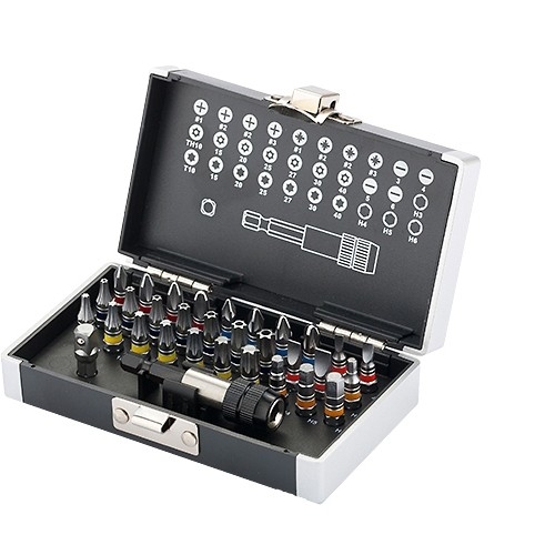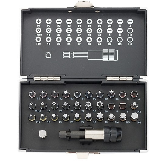 Набор бит с магнитным адаптером Gross 11363 предназначен для монтажа и демонтажа резьбовых соединений с помощью шуруповерта. Он подойдет для ремонтных, монтажных и слесарных работ, в том числе для сборки мебели, бытовых электроприборов, самокатов и велосипедов и т.д.. В комплект входят биты самых актуальных размеров, переходник с шестигранника на квадрат 1/4" и магнитный адаптер для бит. В одном наборе представлено 6 типов бит: PH и PZ калибров 1-3, SL калибров 3, 4, 5, 6, TORX и TORX Tamper (10, 15, 20, 25, 27, 30, 40), HEX 3-6. Самые ходовые размеры PH2 и PZ2 поставляются по 2 штуки. Высококачественная японская легированная сталь S2 обеспечивает повышенную прочность, износостойкость и долгий срок службы бит. За счет металлического шарика-фиксатора переходник надежно удерживает торцевые головки (в комплект не входят). Битодержатель с магнитом и быстрозажимным механизмом обеспечивает устойчивую фиксацию насадок, что важно при работе в труднодоступных местах.