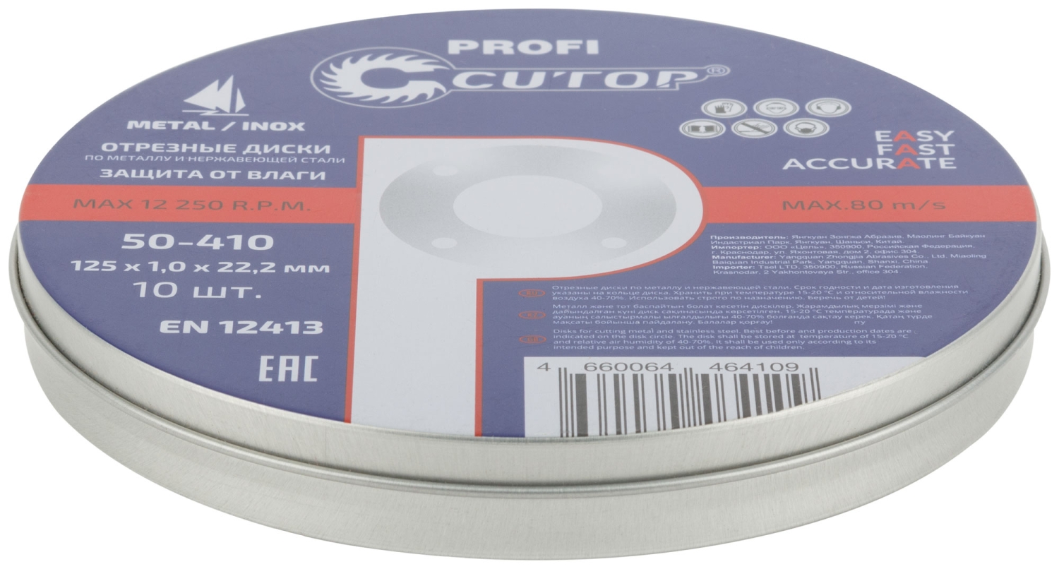 Комплект профессиональных отрезных дисков по металлу и нержавеющей стали, 10 штук. Металлическая коробка, защита от влаги. Диски на основе монокристалического электрокорунда, который улучшает КПД диска и позволяет увеличить количество резов в несколько раз. Для углошлифовальных машин. Посадочный диаметр 22.2 мм.