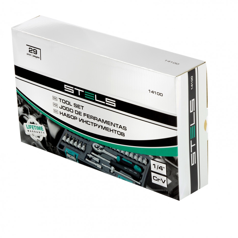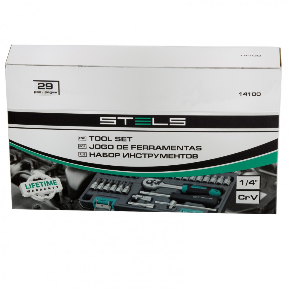 Набор инструментов Stels 14100 в пластиковом кейсе включает в себя 29 предметов с хвостовиком 1/4 дюйма из стали марки CrV. Он применяется для монтажа и демонтажа резьбовых соединений при обслуживании и ремонте авто, а также при выполнении бытовых задач. Инструменты пригодятся автолюбителям и домашним мастерам.Преимущества Трещотка с 72 зубьями вращает крепеж мягко и плавно, что повышает удобство работы. Все детали набора имеют повышенную прочность и износостойкость, т.к. изготовлены из высококачественной стали хромованадиевой группы и термически обработаны Матовое антикоррозийное покрытие надежно защищает инструменты от разрушения. Благодаря эргономичной рукоятке из полипропилена и резины трещотка удобно ложится в руку и не разрушается от воздействия бензина и масла. Механизм быстрого сброса позволяет легко менять насадки на трещотке. Набор поставляется в пластиковом ударопрочном кейсе с металлическими замками, поэтому его легко транспортировать и удобно хранить.